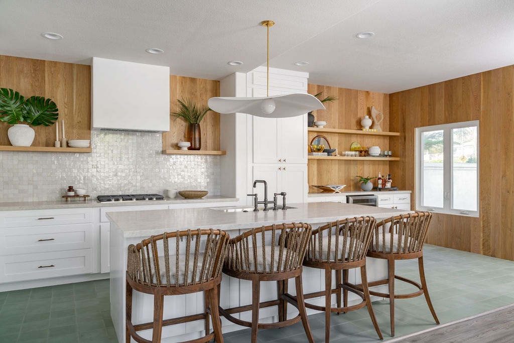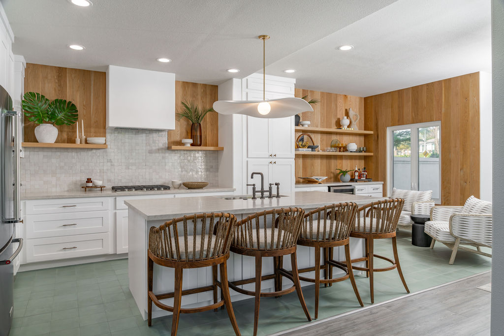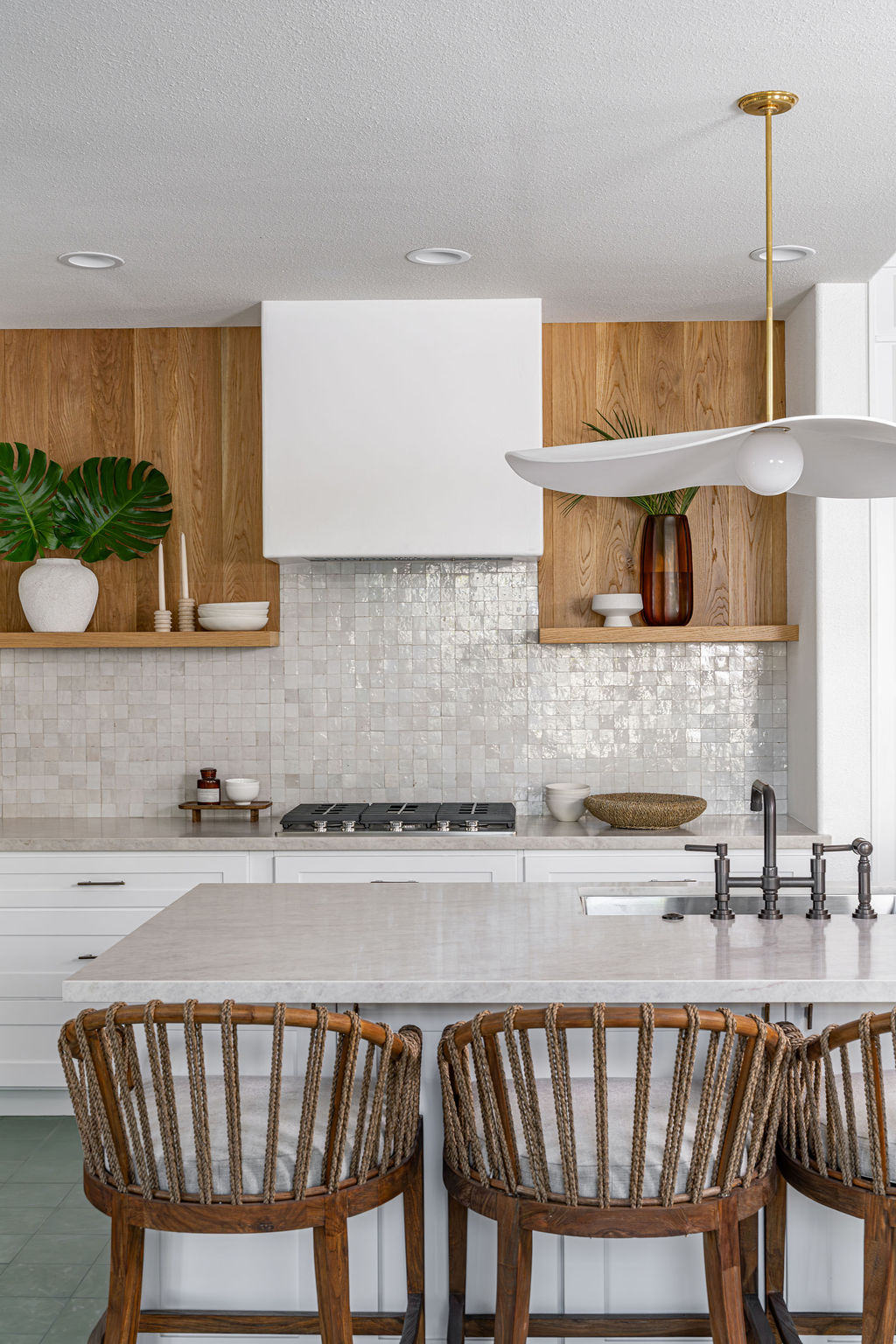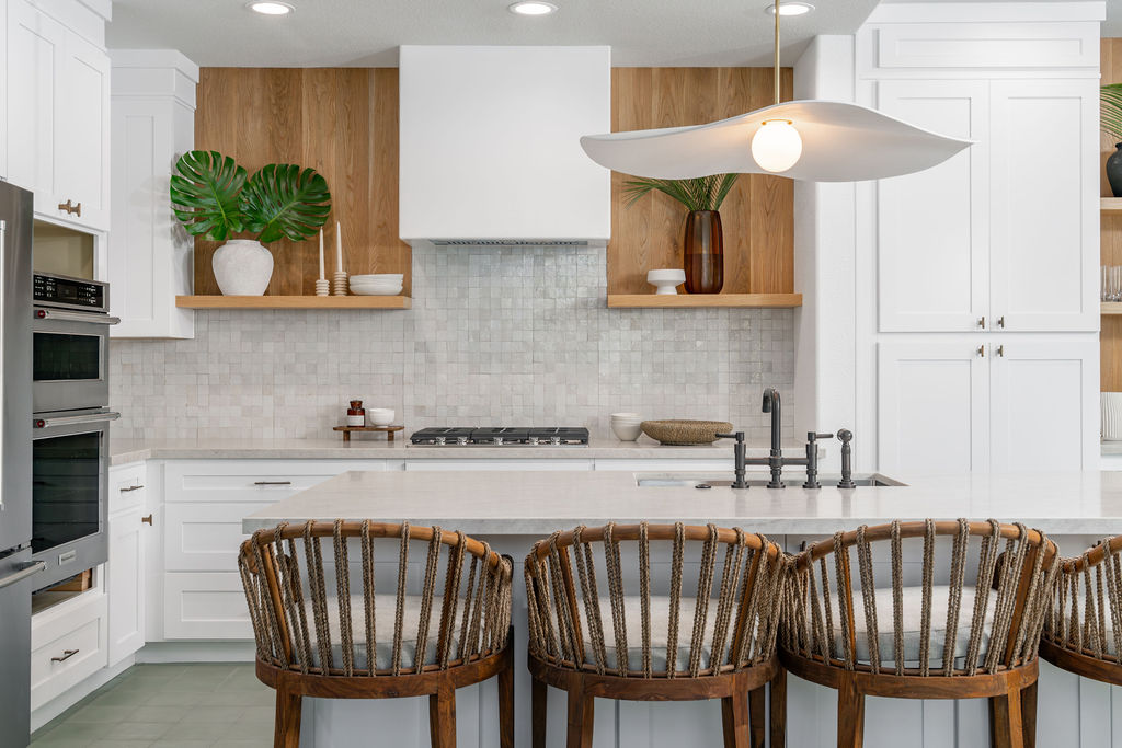 This kitchen remodel pairs crisp white cabinetry and a statement island with warm wood accents, open shelving, and textured details for a bright, modern space that feels both refined and inviting.