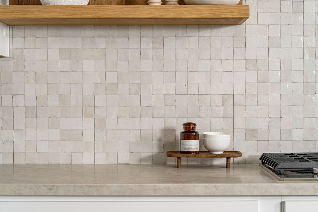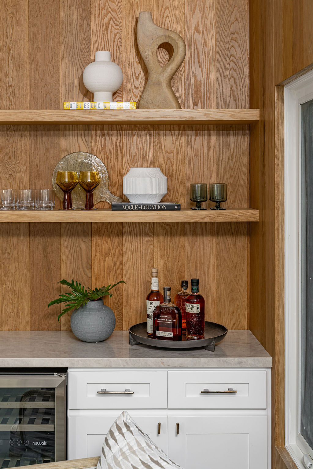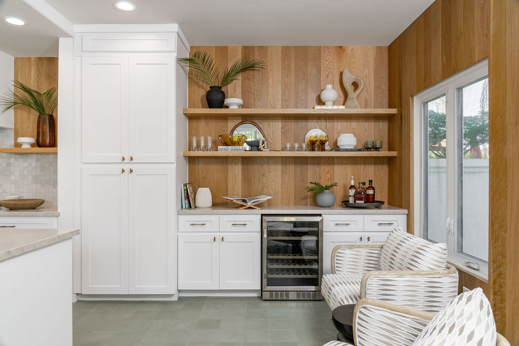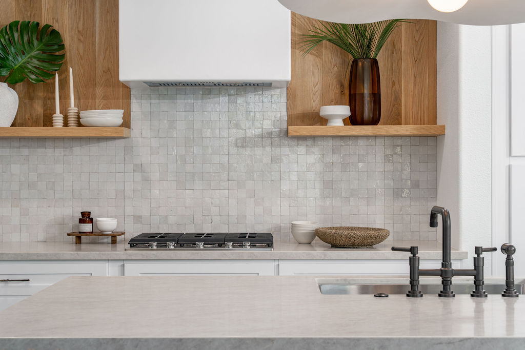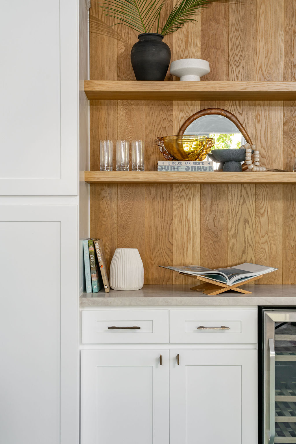 This kitchen remodel pairs crisp white cabinetry and a statement island with warm wood accents, open shelving, and textured details for a bright, modern space that feels both refined and inviting.